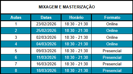 - Noções básicas para mixagem e masterização (equilíbrio, efeitos, estéreo, dinâmica, conceito e finalização)